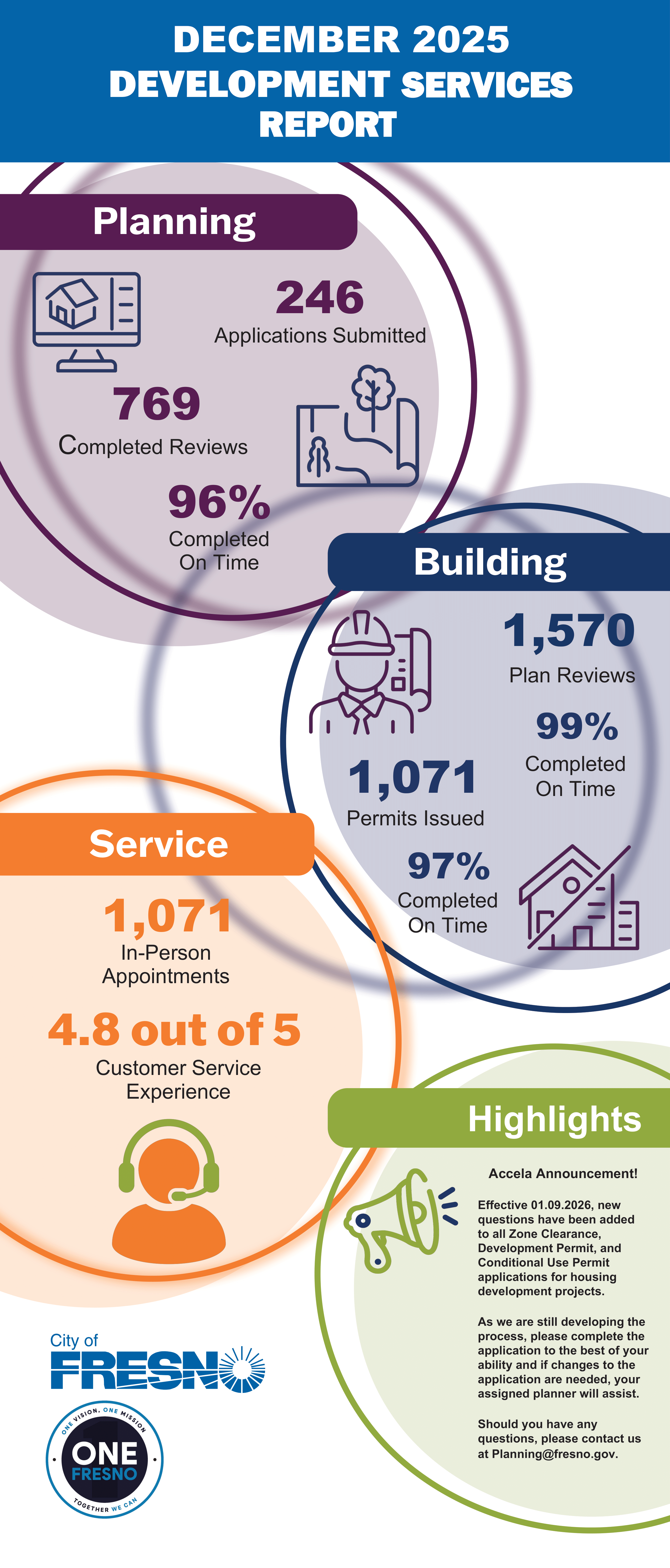 The City of Fresno has established accountability, clear protocols, and authority for decision-making that align with the General Plan, Development Code, and pre-zoning. Improved technology, customer service, and continuous improvement through training and staff development will help us keep the commitment to our standards, to honor developers’ time and budgets, and to work together to “get to yes.”